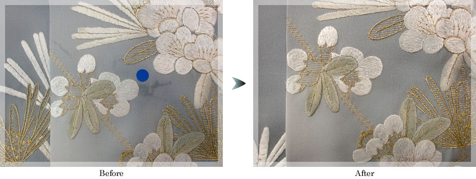 まずは帯をクリーニングソープとクリーニング溶剤を使い、丁寧に、刺繍の柄の部分に気を付けながらクリーニングします。そして、クリーニング機で帯全体を濯いで、4~5日、自然乾燥します。帯が乾いたら、次に残っているジュースのシミを水溶性の洗剤と水を使いクリーニングをしました。アフターの写真を見てください。新品の帯の様です。帯のくすみの汚れも取れ、生地に光沢が戻っています。ジュースのシミも綺麗に取れて、プレスクリーニングをして仕上げました。